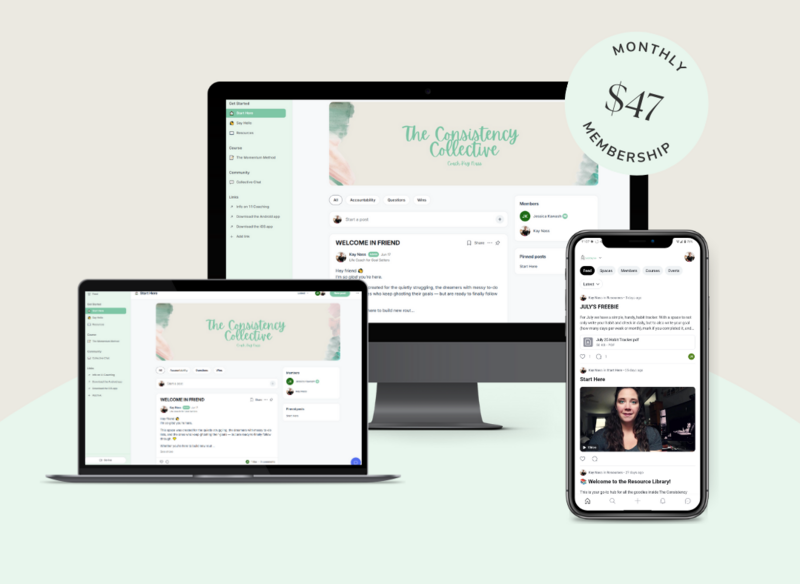 is my monthly membership community, and your one stop shop for accountability, a private group of likeminded individuals, virtual co-working, and a mini course teaching my framework for how I coach, all at an affordable price.